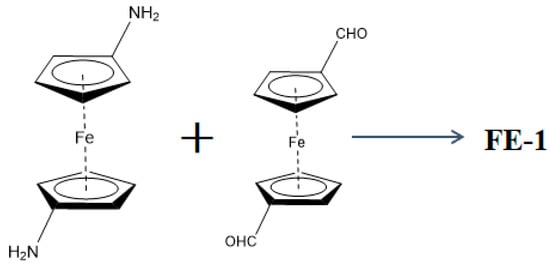 - A Pyrex tube (10 cm) was used as the reaction vessel; diamino ferrocene (0.1 mmol) and dialdehyde ferrocene (0.1 mmol) were dissolved in 3 mL DMAc, 1.5 mL 1,4-dioxane and 0.5 mL acetic acid (6 mol/L). The obtained material is ultrasounded for 5 min and thawed with a freezer pump. The tube was sealed after 3 cycles and left to react at 120 °C for 3d. After the reaction was completed, acetone/DMAC was washed 3 times each. Dry under vacuum at 180 °C overnight. The preparation of ferrocene-based covalent organic material FE-1 is shown in Figure 1.