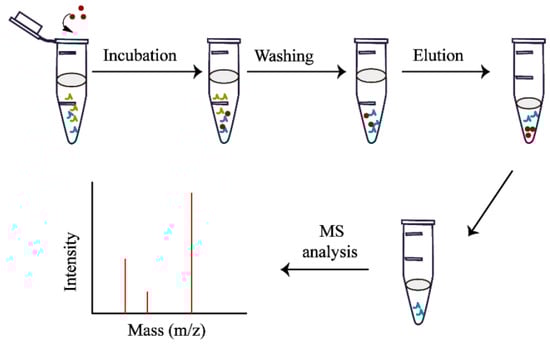 Next, 10 µg of particles is added to 200 μL of loading buffer (ACN/H2O/TFA = 90:8:2, v/v/v) Dilute. After incubating for 30 min at room temperature, the nanocomposite was collected with a magnet, and then washed with 200 μL of buffer (ACN/H2O/TFA = 90:9.9:0.1, v/v/v) 3 times. Finally, the captured phosphopeptides and glycopeptides were eluted with different elution buffers (10 μL each of NH3·H2O and ACN/H2O/TFA, 30/65/5, v/v/v) and analyzed by MALDI-TOF MS.