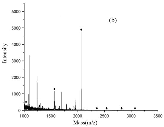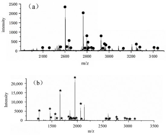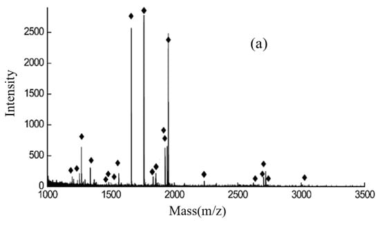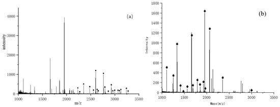 (a) MALDI-TOF mass spectra of the tryptic digests of α-casein. (b) MALDI-TOF mass spectra of the tryptic digests of β-casein.