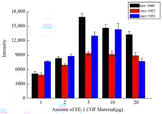 Firstly, the adsorption properties of the materials were evaluated. Phosphopeptides were enriched from 2 µg α-casein tryptic digests by materials of different qualities. Among the detected phosphopeptides, three phosphopeptides (m/z = 1660, 1927 and 1951) were selected as detection markers. As shown in Figure 10, phosphopeptides are enriched by increasing the amount of material. When the amount of material reaches 5 µg, the signal intensity of the three phosphopeptides reaches the maximum. The phosphopeptide enrichment capacity was calculated to be 300 mg/g (Figure 10).