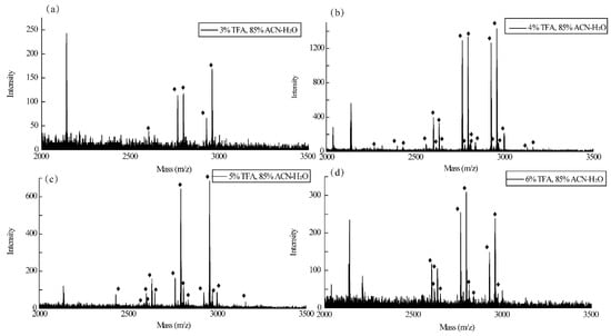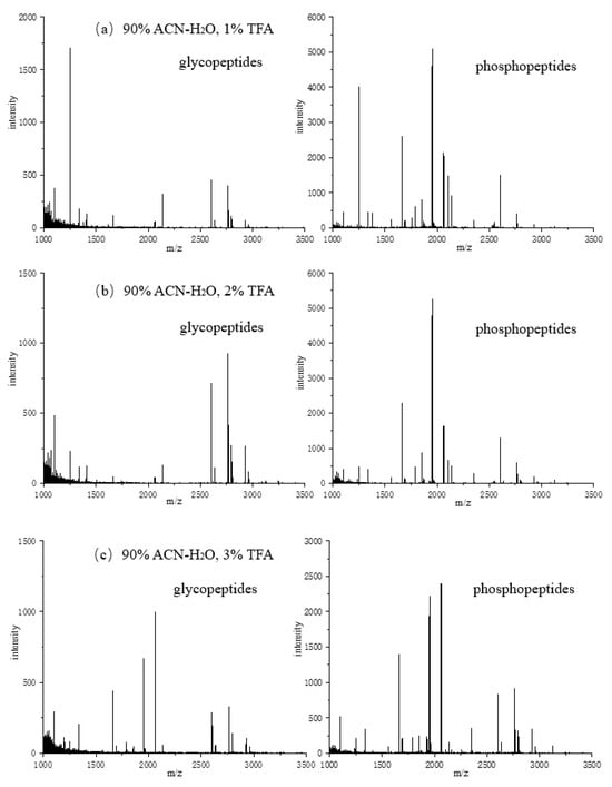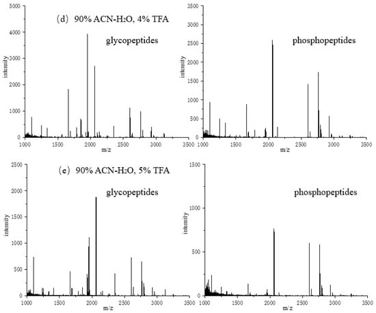 Mass spectra of glycopeptides and phosphorylated peptides in loading buffer enriched with different concentrations of TFA: (a) 1% TFA; (b) 2% TFA; (c) 3% TFA; (d) 4% TFA; (e) 5% TFA.