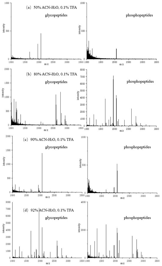 Mass spectra of glycopeptides and phosphorylated peptides enriched in loading buffers containing different concentrations of ACN: (a) 50% ACN; (b) 80% ACN; (c) 90% ACN; (d) 92% ACN.