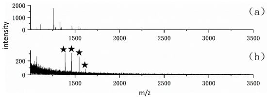MALDI-TOF mass spectra of 4 μL of human serum trypsin digest (a) before, (b) after enrichment by 100 μg FE-1 COF material.