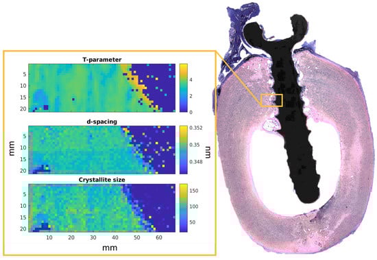 The scanning SAXS/XRD measurements were performed at the P03 microfocus end station at the PETRA III storage ring of the Deutsches Elektronen—Synchrotron (DESY) [27,28]. The energy of the X-ray beam was set at 15 keV with a beam size of 30.6 × 22 μm2. To collect the XRD data, the Lambda 9M detector manufactured by X-Spectrum GmbH (Hamburg, Germany) was utilized. For the SAXS measured, a Dectris Pilatus 2M (DECTRIS Ltd., Baden-Daettwil, Switzerland) was placed at 4 m distance from the sample. For the calibration of the XRD data, lanthanum hexaboride (Lab6) was used, while for the SAXS calibration Silver behenate was applied. For each animal, two samples were harvested. Two 1 × 0.3 mm2 ROIs with a step size of 27 μm and an acquisition time of 1 s per point were acquired for each sample. An example of the ROI is shown in Figure 1. Complementary data on the T parameter and d-spacing was collected at the I22 beam line at Diamond Light Source (Didcot, UK) [29]. The utilized beam size was 15 μm, and the photon energy was 12.4 keV. The data were collected with 2 s of the exposure time using a Dectris Pilatus 3-2M detector, (DECTRIS Ltd., Baden-Daettwil, Switzerland). The Figure 1 shows a histological image of the explant containing a ZX00 implant 24 weeks after implantation. The ROI is depicted within the orange rectangle. The three maps demonstrate the T-parameter, d-spacing, and crystallite size distribution (green and yellow) in the bone around the implant (blue). In addition to the ROIs, a reference region of the cortical bone further from the implant with the size of 0.3 μm × 0.3 μm was measured. The ROIs were located with the help of an on-axis microscope. In total, four ROIs per sample were measured, resulting in an overall number of 12 regions per material and time point.