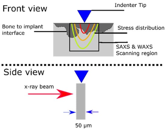 For the in situ nanoindentation study, the embedded bone explants were cut into sections of approx. 100 μm thickness using a Well 3400 diamond wire saw (WELL Diamantdrahtsägen GmbH, Mannheim, Germany) and then fixed onto metal holders. The experiment was performed at the P03 nanofocus end station [28,30] at the PETRA III storage ring of the DESY using their unique indentation setup [31]. The schematic of the measurement is illustrated in Figure 2. A 17 keV photon beam with the size of 1.5 μm × 1.5 μm was used to XRD diffraction rings using a Dectris Eiger 9M (DECTRIS Ltd., Baden-Daettwil, Switzerland). An area of 70 μm × 70 μm under the indenter tip was imaged with an acquisition time of 1 s per scattering image and with a spacing of 2 μm. The region of interest was selected to be at the bone-to-implant interface, while the indenter was pressing the bone at the interface, the force was measured. The scans were obtained after 0 to 2500 mN pressing force with 50–100 mN force steps. Each scan was obtained at a fixed force. One sample per group was assessed.