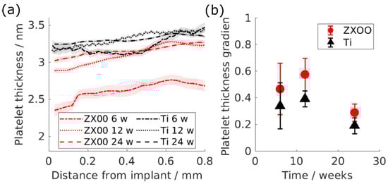 The slope as a function of the healing time is displayed in Figure 3b for both materials. One can assume that this slope should be close to zero in a homogeneous material and larger than one for material changing from the interface to the bulk. The difference in the gradient between the materials is evident in the graph. The platelet thickness of the HAp around the ZX00 implants after 6, 12, and 24 weeks exhibits a line gradient higher than for Ti, which only shows minor changes with the distance at any given time point.