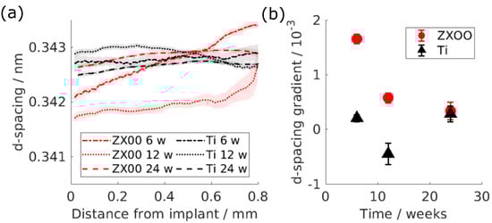 To estimate the degree of that change, the straight line was fitted into the d-spacing at the distance up to 0.8 mm from the implant’s interface and the d-spacing gradient was determined (Figure 4b). The gradient for the HAp d-spacing around the ZX00 implant after 6, 12 and 24 weeks is higher than around the Ti implants.