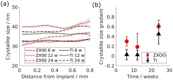(a) Crystallite size of the Bragg’s peak (002) as a function of the distance from the implant interface: red is ZX00; black is Ti. The lines represent the mean values, while the shades represent the 95% confidence interval. (b) The change rate of the line fitted to the crystallite size as a function of the distance up to 0.8 mm from the implant interface. The error bars indicate the 95% confidence interval of the fit.