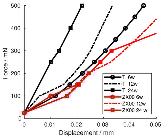 Figure 6 shows the force–displacement curves of the different Ti and ZX00 samples. The curves show that, after six weeks of healing, the Ti and ZX00 samples exhibit a similar increase in the force after the same displacement. After 12 and 24 weeks of healing, the ZX00 sample shows the same trend as that seen at six weeks. However, Ti shows an increasing steepness in the measured force for the same displacement.