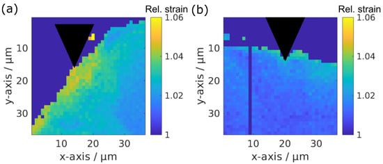 Example maps of the strain distribution in bone around ZX00 (a) and Ti (b) implants after six weeks of healing. The indenter tip position is indicated by the black triangle.