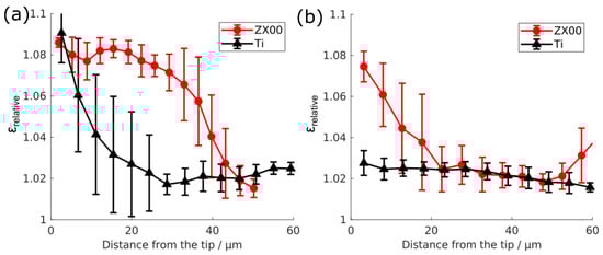 Relative strain in the bone tissue at the ZX00 or Ti implant interface after six (a) or 24 (b) weeks after the implantation depending on the distance from the indenter tip at 150 and 200 mN, respectively.