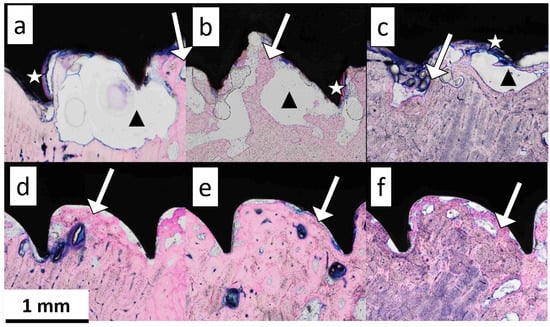 Figure 9 shows the stained sheep bone slices in the vicinity of the implant with bone tissue stained in pink, soft tissue in blue, and metal implant screws in black. In the regions around the ZX00 screws at 6, 12, and 24 weeks after the implantation (Figure 9a–c), the voids attached to the implants are visible. The voids do not contain any cells. Much smaller voids in comparison to those near ZX00 could be found at the Ti implant surfaces (Figure 9d–f). A large void area, potentially containing gas from the degradation process, was present on the surface of the ZX00 implant after six weeks of healing (Figure 9a, black triangle). After 12 weeks, an increase in the number of void areas distributed on the whole surface was observed (Figure 9b, black triangle). After 24 weeks of healing, a smaller void area was found around the ZX00 screw (Figure 9c, black triangle). The degradation layer forming on the implant interface is visible (white stars) after six weeks of healing. The degradation layer was stained pink due to high Ca and P content, similar to the bone tissue [4]. No fibrosis capsules were observed in any of the samples.