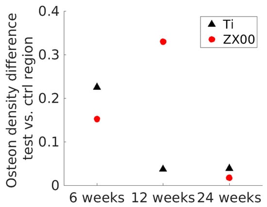 Newly formed bone tissue is highlighted by the brighter pink staining at the bone-to-implant interface at the bone site in all samples (Figure 9, white arrows). Additionally, the concentration of osteons appears to increase from six to 24 weeks. To derive quantitative data from the histology images, the osteon density around the implant and in the control area were determined. The osteon density around the ZX00 implant was significantly lower than that in the control region at six and 12 weeks of healing, while having a similar value to the control ROI at 24 weeks of healing. For Ti, the dynamics appeared to be different: the osteon density around the Ti implant was significantly lower than that in the control region after six weeks of healing, and did not differ significantly between near-bone ROI and control after 12 and 24 weeks (Figure 10).