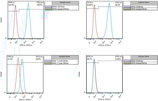The flow cytometry results showed characteristic markers of DPSCs CD73 (100%), CD90 (99.4%), and CD105 (58.8%) and lacked an expression of CD45 (0.336%).