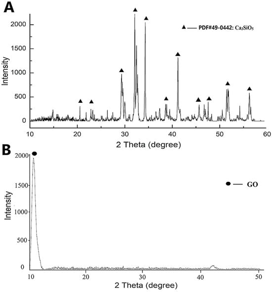 X-ray diffraction (XRD) analysis revealed the distinctive peaks associated with tricalcium silicate (Ca3SiO5) (A) and graphene oxide (GO) (B).