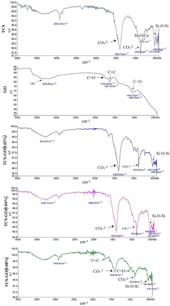 FTIR analysis of TCS-GO composites revealed characteristic peaks for O-Si-O, Si-O-Ca, and calcite’s carbonate group in TCS, as well as C-O, C=C, C=O, and OH groups in GO. These peaks were observed in various TCS-GO composites with different GO weight percentages.