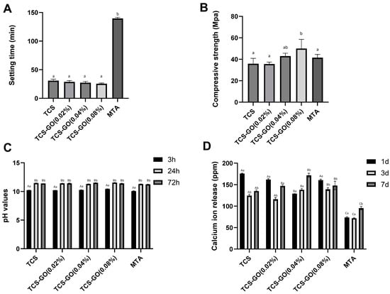 (A) The setting time of the TCS-GO and control groups. (B) The compressive strength of the TCS-GO and control groups. Different lowercase letters indicate significant differences between the groups as indicated by one-way ANOVA with Bonferroni post hoc test (p < 0.05). (C) The pH values of the prepared TCS-GO composites. (D) Calcium ion release in ppm of the prepared cements. Different lowercase letters represent significant differences between the groups, while different uppercase letters show significant differences within individual groups as indicated by two-way ANOVA (factor 1: groups, factor 2: time points) with Bonferroni post hoc test (p < 0.05).