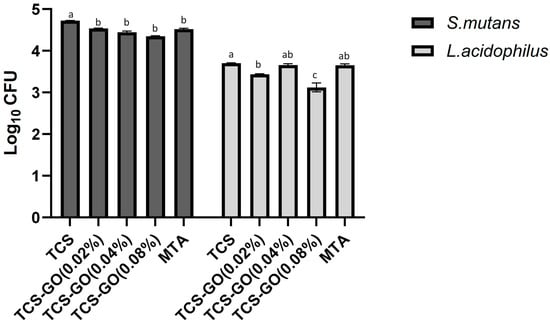 Moreover, we investigated the antimicrobial properties of TCS-GO composites. The presence of cariogenic bacteria such as S. mutans and L. acidophilus in the vicinity of the exposed pulp can have a detrimental effect on the success of REPs as they contribute to persistent inflammation in pulp tissues []. These bacteria can invade the dentinal tubules and release toxins, leading to the inflammation and destruction of the pulp tissue. The antimicrobial activity of TCS-GO composites was significantly better than the TCS group, with TCS-GO (0.08%) showing the most promising results. When GO forms a composite with another substance, it can enhance the antimicrobial activity of the original material [,]. This improvement in antimicrobial properties is crucial for preventing bacterial infections and promoting healing in REPs.