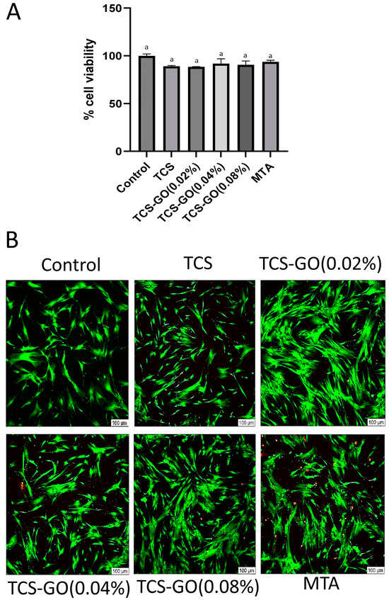 Both TCS and TCS-GO composites were biocompatible and expressed over 88% cell viability. No significant difference in cell viability was found between the experimental groups and control and MTA groups (p > 0.05) (Figure 6A).