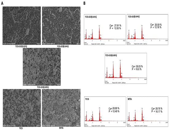 The formation of an apatite-like layer on the surfaces of samples was assessed using SEM and EDX elemental analysis. A well-developed apatite layer was formed on the surfaces of all experimental TCS-GO composites, which was comparable to TCS and MTA. A slight increase in the apatite layer deposition was seen in the TCS-GO (0.08%) group compared to the TCS-GO (0.02%) and TCS-GO (0.04%) groups (Figure 7A). EDX elemental analysis displayed a marked increase in the atomic % of P in all groups after 7 days of immersion in PBS, which indicates the possible formation of hydroxyapatite-like crystals (Figure 7B).