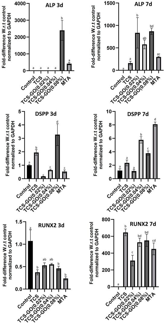 Relative gene expression of ALP, DSPP, and RUNX2 at 3 and 7 days. Different lower-case letters represent significant differences between groups as indicated by one-way ANOVA with Bonferroni post hoc test (p < 0.05).