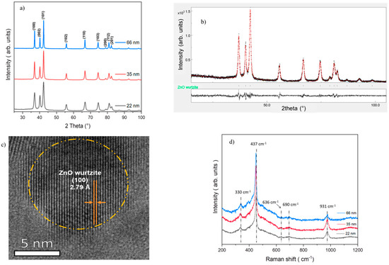 All ZnO samples are well crystallized in the wurtzite phase, as confirmed using X-ray diffraction (Figure 1a) and Rietveld refinement (Figure 1b). Rietveld refinement analysis showed the stability of the cell parameters (a, c) and revealed varying sizes—22 nm, 35 nm, and 66 nm (Table 2). In addition, the transmission electron microscopy (TEM) image of 22 nm NPs confirmed the formation of small and well-crystallized ZnO wurtzite NPs (Figure 1c). Raman spectra also confirmed the crystallinity of the samples, showing characteristic Raman modes indicative of the ZnO wurtzite structure (Figure 1d).