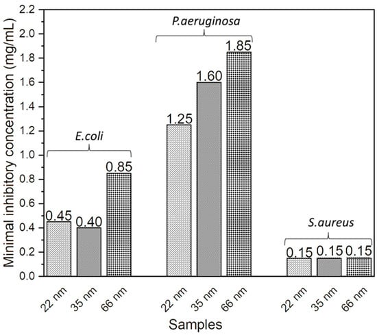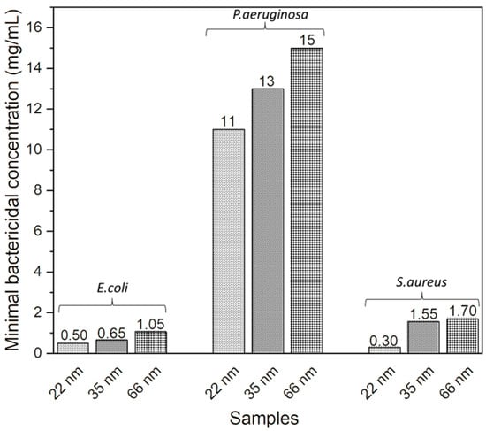 The MBC corresponds to the lowest concentration of NPs, resulting in the death of 99.9% of the initial bacterial population. It was observed that the MBC of NPs against the three bacteria decreased as their size decreased, indicating an improvement in the antibacterial activity of the NPs and confirming the results obtained previously (Figure 3). Specifically, its values were 0.5 mg/mL, 0.6 mg/mL, and 1.05 mg/mL for sizes of 22 nm, 35 nm, and 66 nm against E. coli, respectively. For P. aeruginosa, the values were 11 mg/mL, 13 mg/mL, and 15 mg/mL for sizes of 22 nm, 35 nm, and 66 nm, respectively. And for S. aureus, the MBC values were 0.30 mg/mL, 1.55 mg/mL, and 1.70 mg/mL for sizes of 22 nm, 35 nm, and 66 nm, respectively.