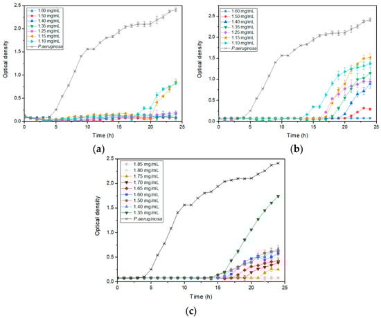 OD600 growth of P. aeruginosa in contact with (a) 22 nm; (b) 35 nm; and (c) 66 nm ZnO nanoparticles at different concentrations.