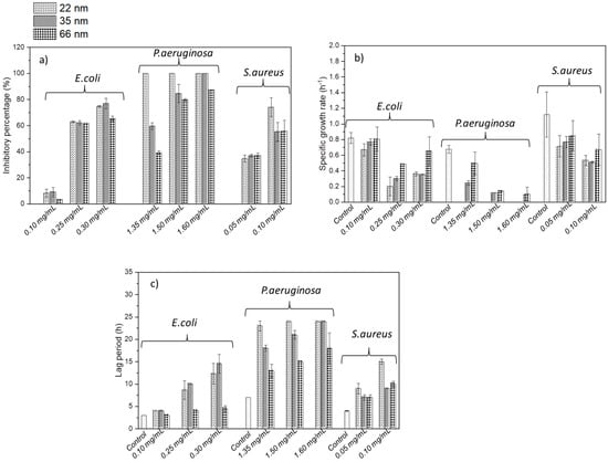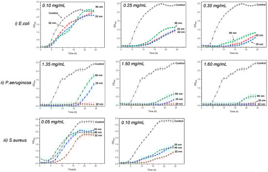 For S. aureus, at 0.05 mg/mL, the specific growth rate was 0.71 h−1, 0.77 h−1, and 0.85 h−1 with 22 nm, 35 nm, and 66 nm NPs, respectively. On average, it was 0.52 h−1 with 22 nm and 35 nm NPs, and 0.67 h−1 with 66 nm NPs.