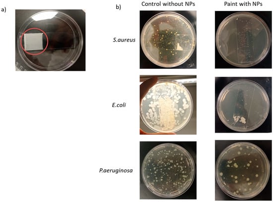 (a) A paint film containing 22 nm nanoparticles, onto which 0.1 mL of bacterial suspension is applied without vortexing; (b) evaluation of antibacterial properties of paint containing ZnO nanoparticles against S. aureus; E. coli; and P. aeruginosa.