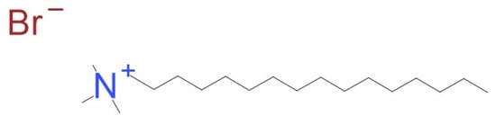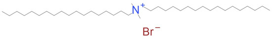 CTAB (Figure 1) is a cationic surfactant used to obtain mesoporous silica nanoparticles [28]. It also has antibacterial properties, i.e., against Escherichia coli, due to the indication of superoxide stress in bacteria cells, and it also penetrates the cell membrane, causing the leakage of essential components of bacteria cells [29,30]. DODAB (Figure 2) is a synthetic versatile lipid used as a surfactant or vaccine adjuvant, and it can create cationic membranes. It also may have potential applications in gene therapy and drug delivery. Due to the positively charged cationic small “head”, the DODAB membrane is stable and interacts well with negatively charged entities. Both CTAB and DODAB alter the bacteria cell surface charge, causing their death. DODAB is also known as an effective flocculant agent [31,32].