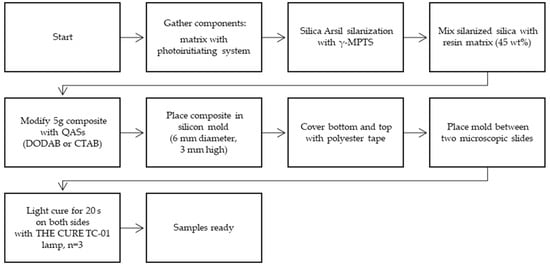 The experimental dental composite without or with addition of QAS was placed in a cylindrical silicon mold (6 mm diameter, 3 mm high), covered on the bottom and upper side with polyester tape (Hawe Striproll, Kerr, Bioggio, Switzerland) to prevent the formation of the oxide inhibition layer. To obtain even sample surfaces, mold with composite and polyester tape was placed between two microscopic slides, and the material was lightly cured for 20 s on both sides with THE CURE TC-01 polymerization lamp (Spring Health Products, Norristown, PA, USA). A flowchart of the sample preparation is presented below (Figure 3).