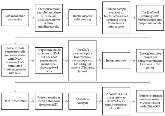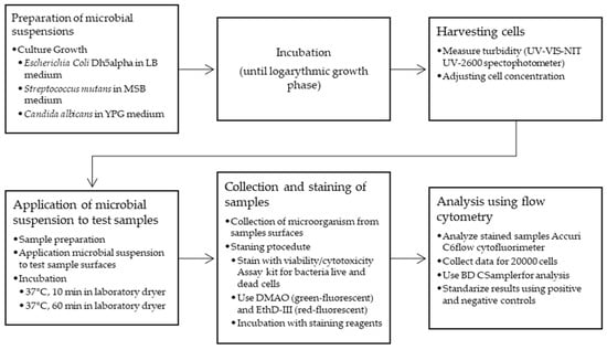 Escherichia coli DH5alpha, Streptococcus mutans NCTC 10449, Candida albicans NCCLS 11 (all from ATCC, Manassas, VA, USA) were used in this study. The bacterial or fungal suspensions (10 µL) were applied to the surfaces of the test sample, corresponding to the application of approximately 4 × 105 cells in a logarithmic growth phase. Cell counts were determined by using a method previously developed in our lab. Simultaneous turbidance measurements using a UV-VIS-NIR UV-2600 spectrophotometer (Shimadzu, Kyoto, Japan), and cell counting using an automatic EVE NanoEntek cell counter (Seoul, Korea) enabled the development of a standardized method to determine cell abundance based on turbidimetric measurements. This method was standardized for each microorganism used separately and incubations were carried out for two contact times—10 min and 60 min at 37 °C in a laboratory dryer. After incubation, the bacterial suspension was carefully collected from the surface and then subjected to the staining procedure according to the ‘Viability/Cytotoxicity Assay kit for Bacteria Live and Dead Cells’ (ImmuniQ, Żory, Poland). After incubating with two fluorescent reagents (DMAO was a green-fluorescent nucleic acid dye that stained both live and dead bacteria and Ethidium Homodimer III (EthD-III) was a red-fluorescent nucleic acid dye that selectively stained dead bacteria with damaged cell membranes), the results were read using an Accuri C6 flow cytofluorimeter (BD Biosciences, Franklin Lakes, NJ, USA) and then analyzed using BD CSampler software (BD Biosciences, Franklin Lakes, NJ, USA). Simultaneous standardization was performed using a positive control (live cells) and a negative control (dead cells). Moreover, 20,000 passages were collected each time, corresponding to 20,000 cells analyzed. A suspension collected after 24 h of culture (logarithmic growth phase culture) was used. For the Escherichia coli strain DH5α, LB medium was prepared with the following composition: NaCl (1%), Bacto Peptone (1%), and yeast extract (0.5%), with a pH equal to 7.0. For Candida albicans, a YPG medium was used with the following composition: yeast extract (1%), Bacto Peptone (1%), and glucose (2%), with a pH of 7.4. For Streptococcus mutans, MSB medium (mitis-salivarius-bacitracin from BD Biosciences, Franklin Lakes, NJ, USA) was used [34]. The flow chart of the procedure is shown below (Figure 4).