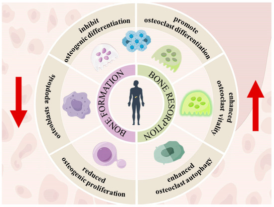 Out-of-balance bone regeneration in diabetic states. The left half depicts the inhibitory effects of diabetic condition on bone formation. The right half highlights the promotion of bone resorption.