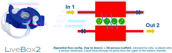 MG-63 cells were cultured on FN-sc scaffolds in a perfusion bioreactor (IVTech, Pisa, Italy) to evaluate cell viability under the effects of a dynamic culture system. MG-63 cells were seeded on top of the scaffold (4 mm in height, 5 mm in diameter, 2 × 105 cell/scaffolds in 40 μL of DMEM High-Glucose medium), maintained on a 24 well-plate, and incubated for 4 h at 37 °C and 5% CO2 in static conditions to allow adhesion to the structure, after which 2 mL of medium was added. A period of 24 h after seeding, samples were placed in the bioreactor chambers of LiveBox 2 (Figure 1) and connected to the bioreactor circuit, and the flow rate was set to 0.15 mL/min for three days and then to 0.2 mL/min for the remaining course of the experiment. During this period, the bioreactor was located inside of a biological incubator at 37 °C and 5% CO2.