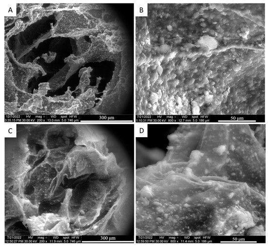The adsorption of Fibronectin on the scaffold structure was studied qualitatively after 24 h of adsorption through eSEM analysis. The imaging was performed on the cross-section of both the Ctrl-sc and FN-sc scaffold (Figure 2). The images for Ctrl-sc (A and B) and FN-sc (C and D) show the rough surface of the scaffold trabeculae, confirming the presence of hydroxyapatite in both preparations. The presence of Fibronectin can be appreciated as a thin translucent layer covering the surface of the scaffold, as it is shown in Figure 2C,D.