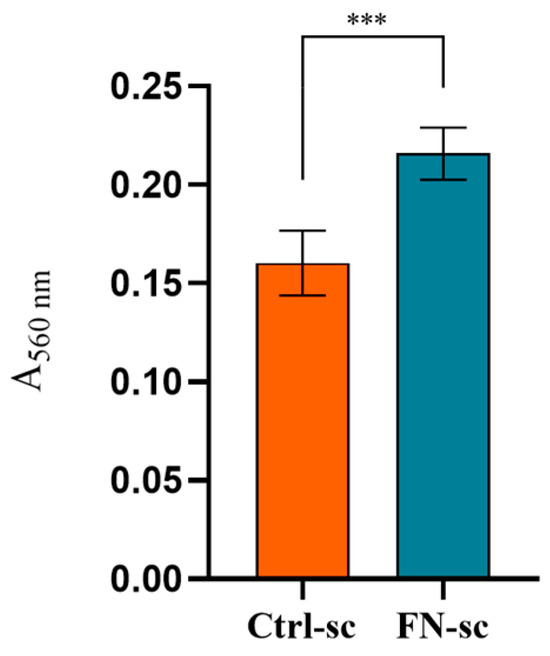 Further analyses to confirm the presence of Fibronectin, after functionalization, were conducted using a μ-BCA protein assay. The results shown in Figure 3 demonstrate a significant difference in the absorbance between Ctrl-sc and FN-sc, confirming the presence of Fibronectin, as well as the stability of the coating after 24 h of incubation in PBS, later confirmed by the μ-BCA protein assay and Coomassie blue staining, as reported in Supplementary Materials (Figures S2 ad S3). As reported in Figure S4 of the Supplementary Materials, the FT-IR analysis was unable to detect the presence of Fibronectin due to its low concentration.