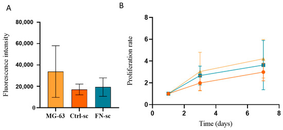 MG-63 cell proliferation in the Fibronectin-functionalized scaffolds was evaluated to investigate the biological effects of the Fibronectin coating. The evaluation of cell adhesion by the Alamar Blue test (Figure 4A) did not show any statistically significant difference when the cells were cultured in the Ctrl-sc or in the FN-sc. The proliferation rates, calculated by normalizing the fluorescence reads at each time point with respect to day 1, were also compared with control cells grown on the surface of a multi-well plate. Cell proliferation data, reported in Figure 4B, show that both Ctrl-sc and FN-sc are able to sustain cell colonization and proliferation with a slight improvement in FN-sc if compared with Ctrl-sc, although the differences are not statistically significant.
