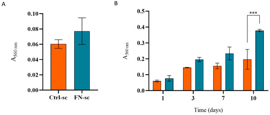 Furthermore, the MTT test (Figure 5) was used to assess the cell viability. In comparison to the Alamar analysis, on day 1 (A), the absorbance values are similar between the two conditions, whereas over time (B), the MTT test shows a statistically significant increase in cells grown in FN-sc compared to Ctrl-sc, after 10 days of culture.