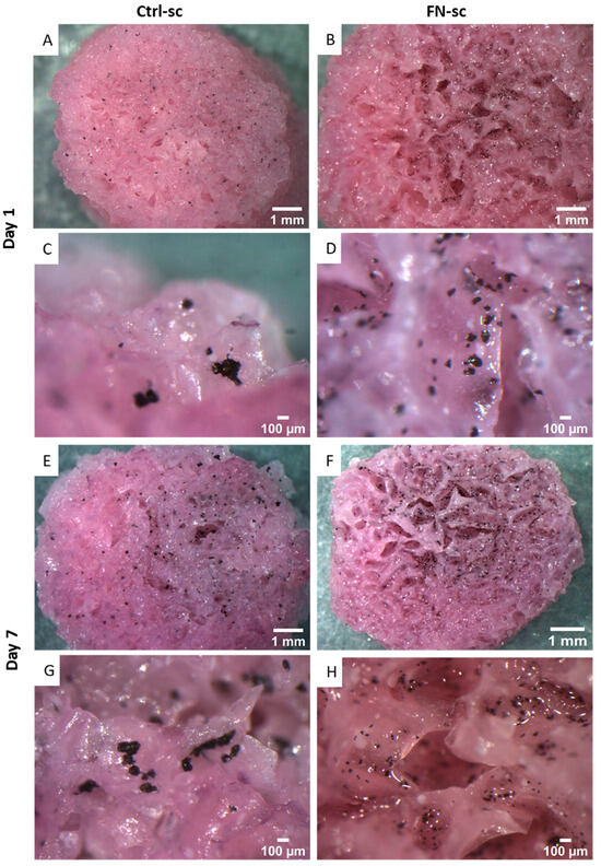 The MTT assay was also used as a qualitative assay; in fact, the insoluble formazan crystals allowed the identification of purple clusters corresponding to viable cell clusters. In particular, on day 1 and day 7 after seeding, the results of the viability test were compared with the images obtained using a stereoscope (Figure 6) on both scaffolds. The images show that on the functionalized scaffold, the MG-63 cell population forms smaller cell clusters uniformly distributed all over the surface, compared to the Ctrl-sc, where the cell clusters are less distributed, mainly on the external surface. At a higher magnification (C and D), cell clusters on day 1 are notably larger and less numerous on Ctrl-sc, whereas in functionalized scaffolds, they are smaller and colonize the surface better, thus indicating that the cells are better distributed on Fibronectin-functionalized scaffolds.