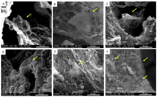 The cell morphology on the scaffold surface was studied by environmental SEM analysis (Figure 7); after one week of culture, the MG-63 cells in adhesion on Ctrl-sc and on FN-sc can be distinguished thanks to their smooth surface compared to the rough scaffold surface. Cells on Ctrl-sc (A; B; C) did not appear to be well spread, as already seen, and exhibited a round shape morphology, while those on the FN-sc ones (D; E; F) appeared to adhere more favorably, displaying a spread morphology.