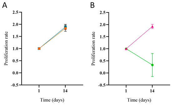 The Alamar Blue assay was used to quantitatively measure the metabolic activity of living cells on the scaffolds. At the specific time points, the culture medium was removed and the samples were moved into a new 24-well culture plate to remove cells adhered to the old culture plate. An amount of 700 µL of a solution of Alamar Blue (Merck, St. Louis, MI, USA) diluted 1:30 in DMEM High-Glucose medium was then added to each scaffold, which were then incubated for 4 h at 37 °C and in 5% CO2 in dark conditions. After incubation, 200 µL of culture medium, for each sample, was transferred to a 96-well black plate, and the fluorescence intensity (excitation wavelength: 544 nm; emission wavelength: 590 nm) was measured using a GloMax Multi+ Detection System (Promega Corporation, Madison, WI, USA). The fluorescence of the Alamar solution incubated with an empty scaffold was used as the background. After the measurements, the scaffolds were gently washed with phosphate-buffered saline (PBS) to remove the Alamar Blue solution and 2 mL of fully supplemented DMEM was added to each well. The proliferation rate for each sample was calculated as the ratio between the fluorescence read at each time point and the fluorescence of the same scaffold read on day 1.
