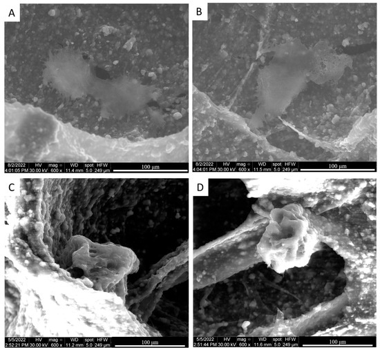 To support the data, micrographs acquired with eSEM (Figure 9) show the cells well adhered and spread on the Fibronectin-functionalized scaffold surface after 14 days of dynamic culture (A; B), while the morphology of the cells cultured in Ctrl-sc appears more round-shaped, proving that the cells were not well adhered and spread if compared to the ones cultured on FN-sc (C; D).