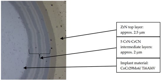 A total of 18 flat test samples made of either CoCr28Mo6 (material composition according to ISO 5832-12:2019 [25]) (CoCrMo) or Ti6Al4V (material composition according to ISO 5832-3:2021 [26]) (TAV), with a diameter of 20 mm and thickness of 5 mm, were initially surface grinded and subsequently polished to a Ra < 0.05 μm. These test samples represented the same material used for commercial implants where the ZrN coating is currently applied using an arc process. Samples were cleaned in a water-based alkaline bath including ultrasound and de-ionized water rinse baths and dried in hot air. Prior to coating deposition, these coupons were pretreated by argon ion etching in cases where sputter deposition was conducted and argon ion and chrome ion etching in cases where arc deposition was conducted. For the ZrN multilayer coating, five alternating intermediate layers of chromium nitride (CrN) and chromium carbonitride (CrCN), and a final zirconium nitride (ZrN) layer were deposited (Figure 1). These intermediate layers help to serve as a bridge between the differing hardnesses and to mitigate residual stress of the softer base material (CCM and TAV) and the hard ZrN top coating. The hardness of the intermediate CrN and CrCN layers were evaluated to 23.3 ± 1.5 GPa and 12.3 ± 1.1 GPa, respectively [27]. In addition, the interfaces between the individual layers act as a diffusion barrier for ions of the base material (CCM or TAV), to mitigatethrough the top layer (ZrN) as well as improving the elastic modulus, as the multilayer coating has a finer crystalline structure compared to a monolayer coating [28].