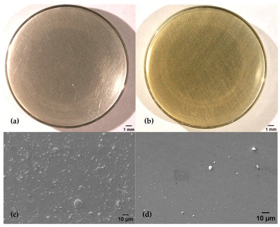 Appearance of coatings prior to accelerated oxidation deposited by (a) arc and (b) pulsed sputtering methods. Representative SEM plan-view micrographs showing the morphology of (c) the arc-deposited coating and (d) sputtered coatings at 1000× magnification.