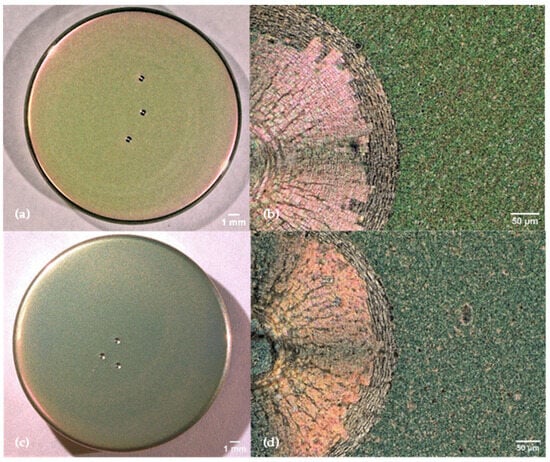 Appearance of coatings deposited by (a) arc and (c) pulsed sputtering methods after 10 days of accelerated oxidation including HRC Rockwell indentations. Representative optical micrographs of Rockwell indentations at 500× magnification of (b) the arc-deposited coating and (d) the sputter-deposited coating.