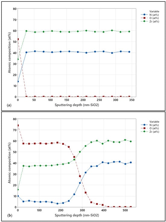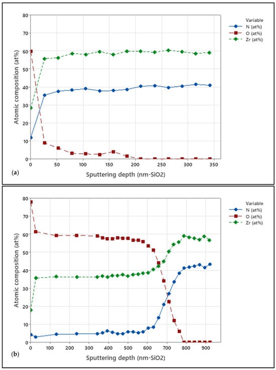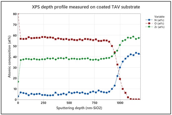 The comparison of the XPS depth profiles for the oxidized sputter coatings deposited on TiAlV and CoCrMo revealed a slight difference in oxide penetration depth. Comparing the O [at.%] signal in Figure 6b and Figure 9, a difference can be observed for coatings deposited on CoCrMo and TiAlV substrate materials. Here, the oxygen content of both samples was elevated to approximately 57 at.% in the surface-near region with depths approximately up to 800 nm and 600 nm for the sputter coating deposited on TiAlV and CoCrMo, respectively. In contrast, the O-penetration depths upon accelerated aging, as obtained from XPS depth profiles for the arc-coated TiAlV and CoCrMo samples, did not show a significant difference and were calculated to approximately 250 nm. This is supported by the XRD results which showed no significant difference in respective peak distribution and intensities of crystal orientation, indicating that the choice of substrate material does not provide a significant influence on the oxidation penetration of the ZrN multilayer.