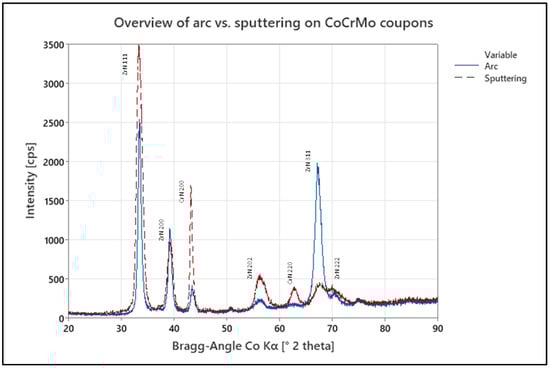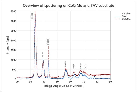 To assess for the influence of the substrate material on the crystal growth of the multilayers, coupons made of either CoCr28Mo6 or Ti6Al4V were coated with the sputter process. A resulting XRD overview of both samples can be seen in Figure 8, where no significant difference is visible in their respective peak distribution. However, there is an increased level of background scattering for CoCrMo samples. This is due to fluorescence radiation of the substrate material (CoCrMo), which is corroborated by the increase in background intensity at increasing diffraction angle 2θ, as the penetration depth into the base material is increased by the increasing angle.