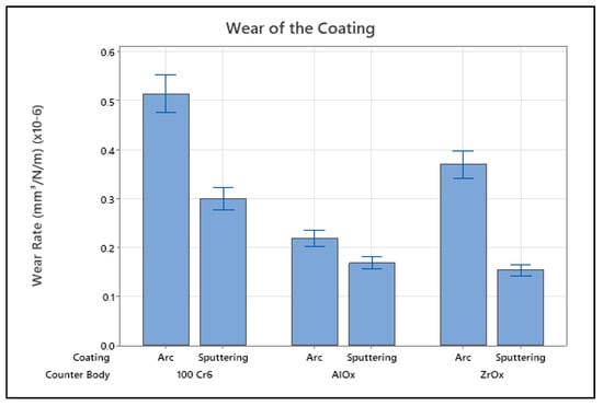 Before carrying out basic application verification tests, ZrN multilayer films deposited on CoCrMo plates either by pulsed sputtering or the arc process were tested to evaluate them for tribological differences. As shown in Figure 10, a measured difference in the wear rate becomes visible between arc- and sputter-coated samples with arc-coated samples having a higher wear rate independent from the counter body material. Furthermore, the lowest wear rate was recorded for the pairing between sputter-coated ZrN and ZrOx, whereas the material combination with the highest wear rate recorded was between arc-coated ZrN and 100 Cr6. Although the test set-up is not clinically relevant, these initial wear results favour the sputter-coated samples, as less coating wear was recorded.