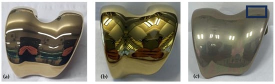 As a result, coatings have been introduced with the aim to reduce wear and to prevent allergic reactions [10,11]. Clinically proven materials used for tribological coatings include zirconium nitride (ZrN), titanium nitride (TiN), titanium niob nitride (TiNbN) or diamond-like carbon (DLC) [12,13,14]. Deposition of these coating materials is achieved using either chemical vapour deposition (PACVD) or physical deposition (PVD)—more specifically cathodic arc deposition. However, problems with monolayer PVD coatings have been reported in the literature, where an ablation of the monolayer occurs due to the weak elastic modulus [15]. The advanced surface (AS) coating from Aesculap AG is based on an arc multilayer approach. It has been proven successful in maintaining its integrity under high-demanding activity (HDA) knee wear, with no signs of delamination or scratches in articulating areas [3]. Furthermore, a reduction in immunological triggering reactions (IL-8 and IL-10) in ZrN multilayer coated implants was observed when compared to uncoated CoCr implants [16]. Finally, clinical data of the ZrN multilayer coating supporting the successful long term clinical service in patients dates back to 2006 [17,18].